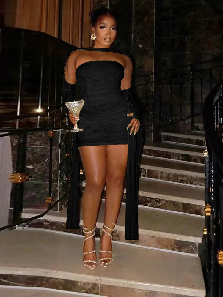 Mesh Mini Dress Strapless Ribbons Tassel Gloves